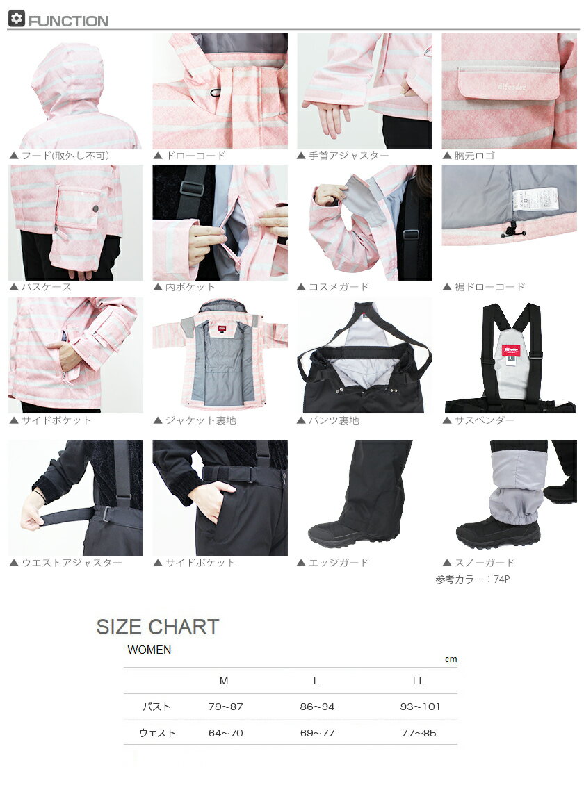 メーカー希望小売価格はメーカーカタログに基づいて掲載しています WINDEX ウィンデックス レディース スキーウェア ■WS-9453 MATERIAL 表地 ポリエステル 100% 裏地 ポリエステル 100% 中綿 ポリエステル 100% SET-UP FUNCTION ・フードアジャスター ・パスケース ・カフストラップシステム ・ハンドウォームポケット ・サイドアジャスター ・お化粧ガード ・チンフラップ ・ウォームインナー ・ワンハンドドローコード ・インナースパッツ ・耐水圧10000mm 雪・雨・風の侵入を防ぎ快適なコンディションを持続的にキープする防水加工素材 耐水圧10,000mmは、約10mの水柱を生地の上に立てた場合と同じ水圧に持続的に耐える事が可能です。